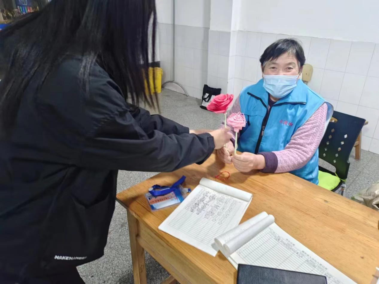 同学们发挥想象力,用五颜六色的折纸,根据小视频和分发的工具制作玫瑰花,制作完成后志愿者们将玫瑰花赠予为我们默默奉献的人,为他们送上美好的祝福,用纸花传递温暖,分享爱与喜悦,传递美好与浪漫。不论是宿管阿姨还是餐饮阿姨在收到花时,幸福喜悦的笑容都不由自主地绽放出来,活动现场弥漫着一股爱的暖流。