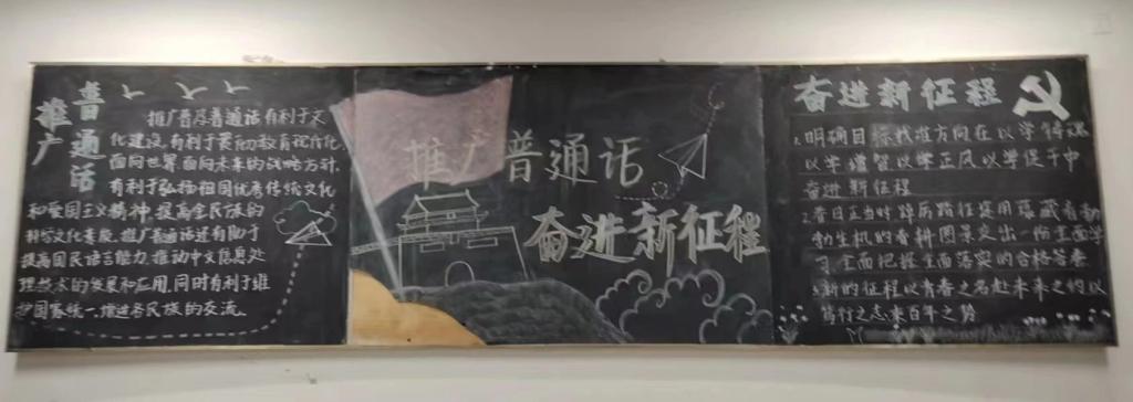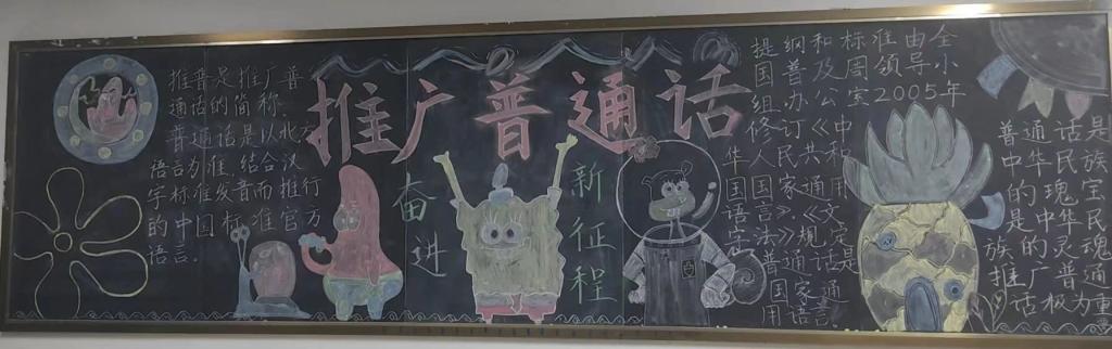 为宣传推广普通话,让普通话深入人心,时时刻刻提醒同学们不忘普通话,公司举办主题黑板报制作活动,同学们精心设计版面,作品色彩艳丽,构思独特,通过制作黑板报让同学们亲自参与到普通话推广的过程中来,在各个班级形成了良好的推普氛围。