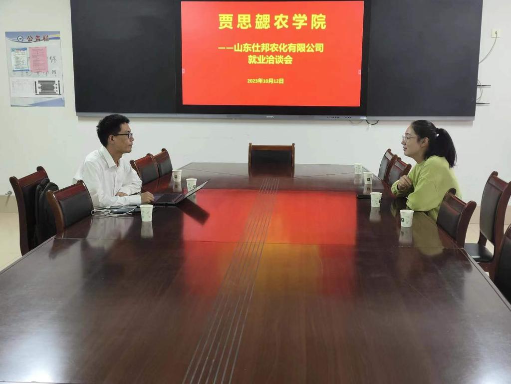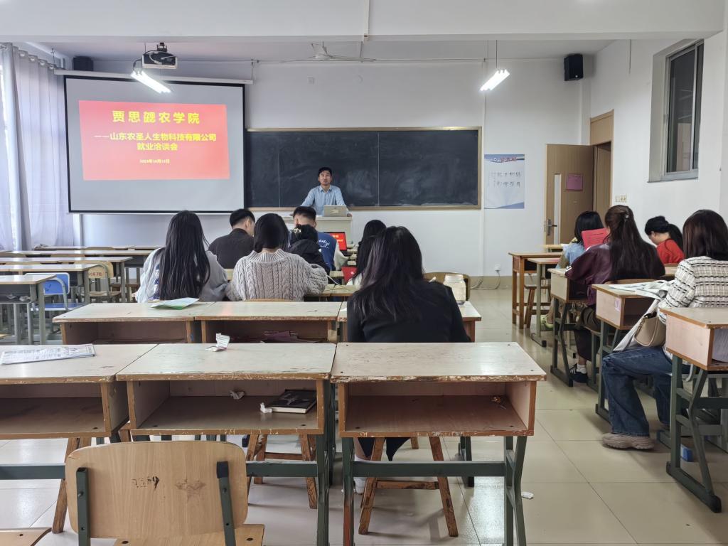 宣讲前,企业代表与党支部副书记李建永、员工科科长高凤、辅导员老师高淋淋进行就业洽谈,双方就人才需求、人才培养、人才供给、实习平台搭建等情况进行交流,加强供需对接,实现合作共赢,给毕业生提供高质量岗位和发展平台,山东农圣人生物科技有限公司、山东仕邦农化有限公司分别就岗位招聘需求,工作待遇,薪资,福利条件等方面向同学们做出详细介绍,并介绍了公司发展情况,发展方向,企业用工需求,岗位特点以及提前介入公司的人才培养过程,与同学们进行深入洽谈,并解答了同学们对于就业实习的一些问题。
