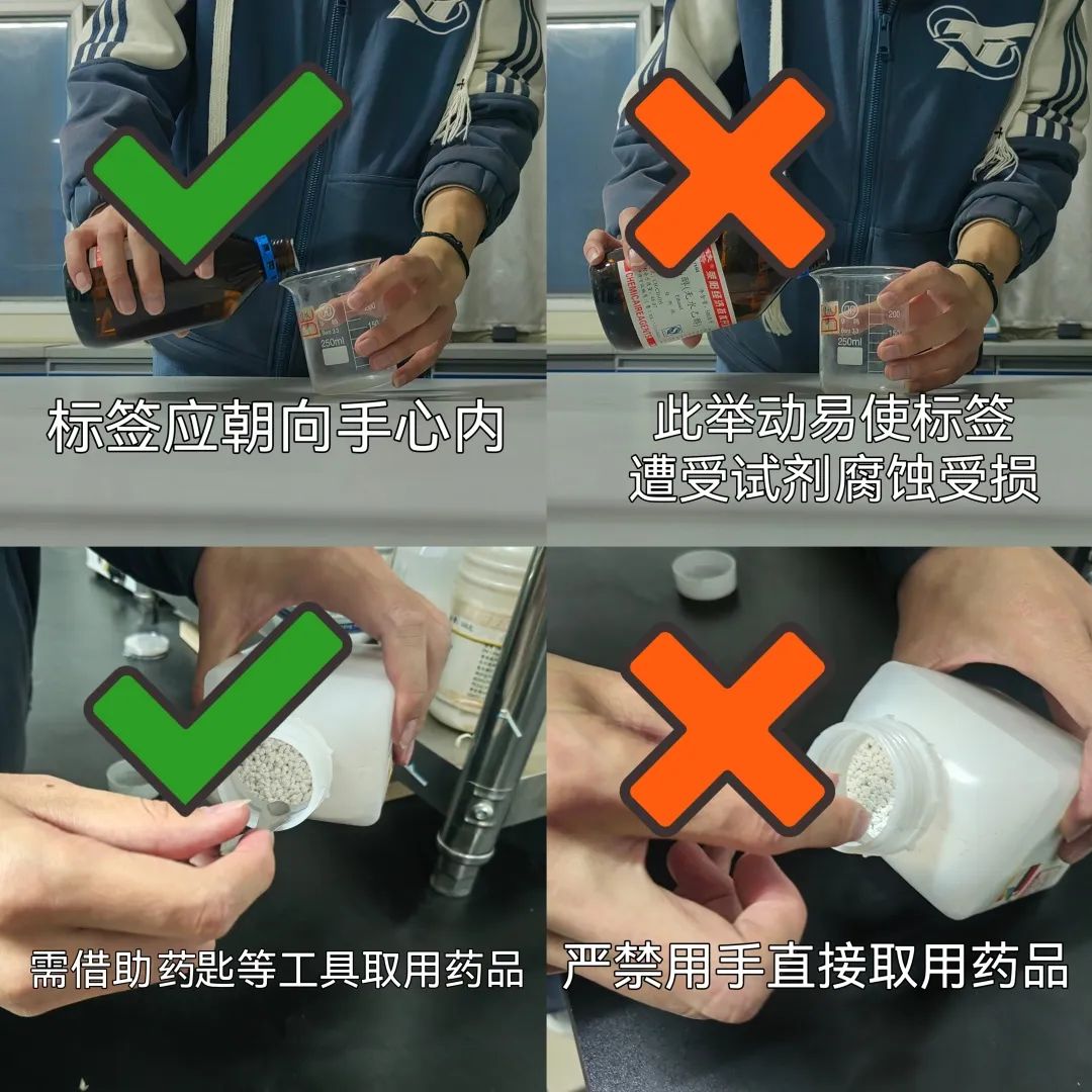 取用腐蚀或刺激性化学试剂(如强酸、强碱、氨水、冰醋酸等)时,尽可能戴上橡胶手套和防护眼镜禁止裸手拿取。倾倒时,切勿正面俯视