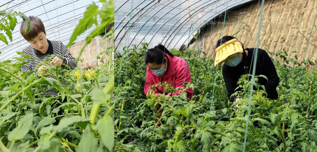图一 吕金浮(左)、杨园园(中)、尼秀媚(右)老师正在进行番茄授粉