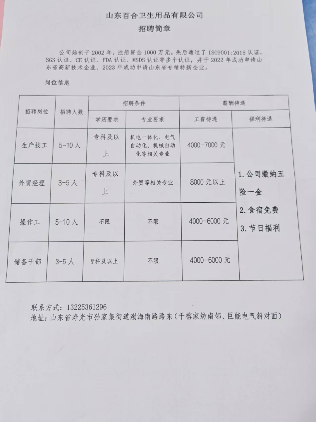 山东百合卫生用品有限公司拥有21年发展历程的行业标杆企业,山东百合卫生用品有限公司已通过ISO9001等多项国际认证,并获评“山东省高新技术企业”“山东省专精特新企业”。目前招聘操作工(5-10人)、储备干部(3-5人),专业不限,薪资范围4000-6000元,联系电话13225361296。