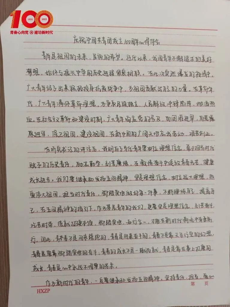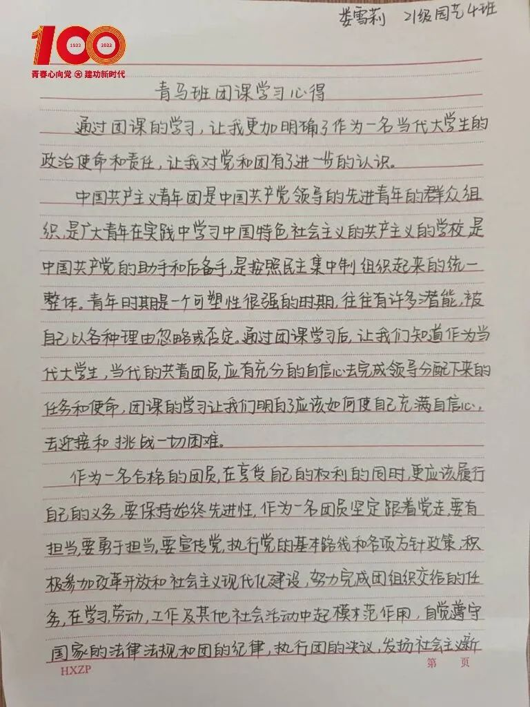 团总支书记刘建伟老师首先带领全体青马班同学共同回顾共青团走过的百年光辉历程,然后学习了习总书记在庆祝建团百年大会上的重要讲话,号召同学们要做有赤诚爱国之心的先进青年,敢于立下鸿鹄之志,树立远大的理想信念,以小我之力成就大业之心,力行求真务实,坚守初心,奋发进取,在创造与奋斗中去实现人生价值、升华人生境界。同学们深受鼓舞、倍感振奋,面对老师的期盼,同学们用文字记录心中感悟,纷纷表示将立足所学专业,要用青春的智慧和汗水打拼出一个更加美好的明天。