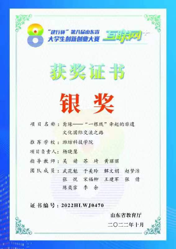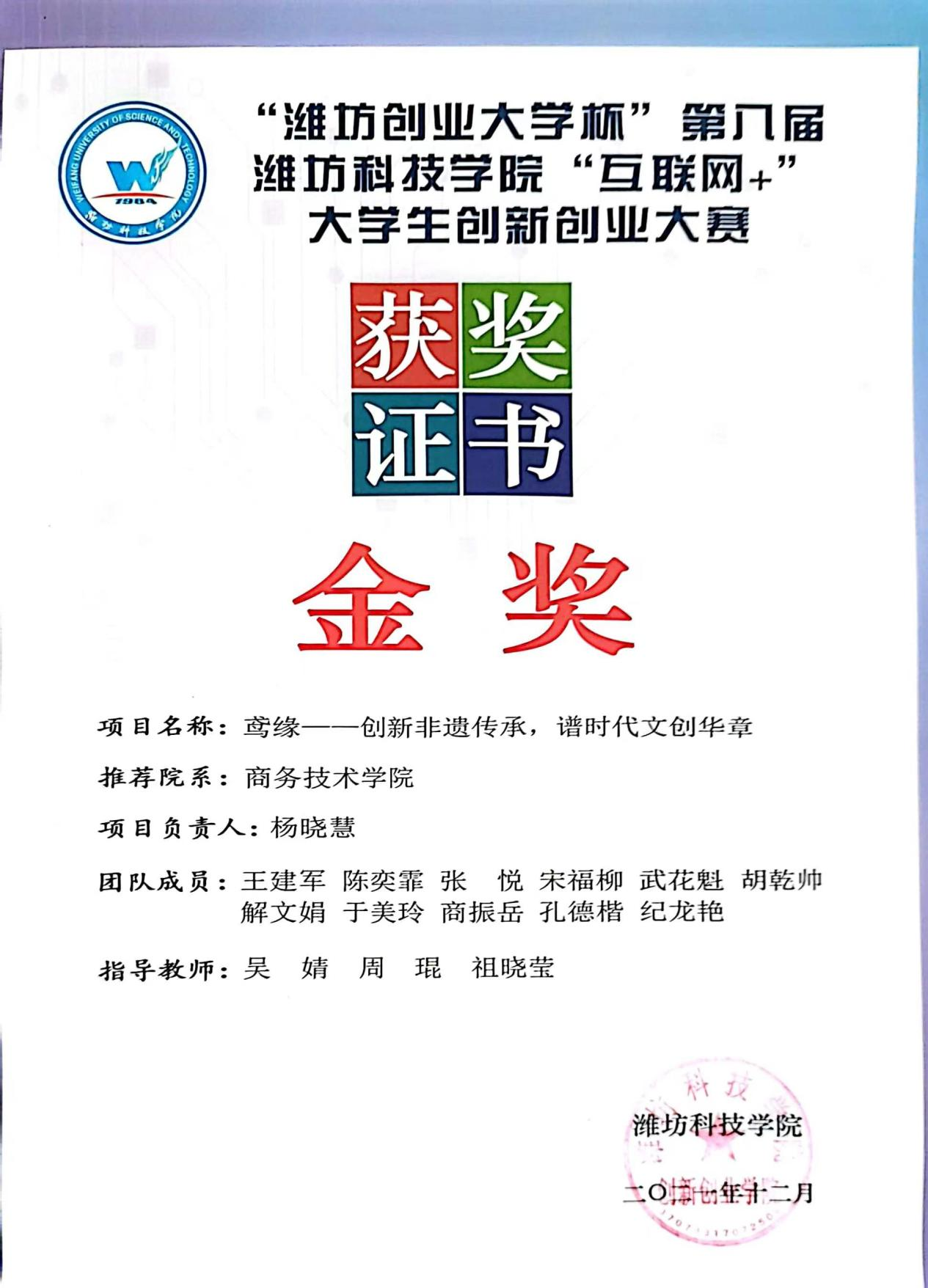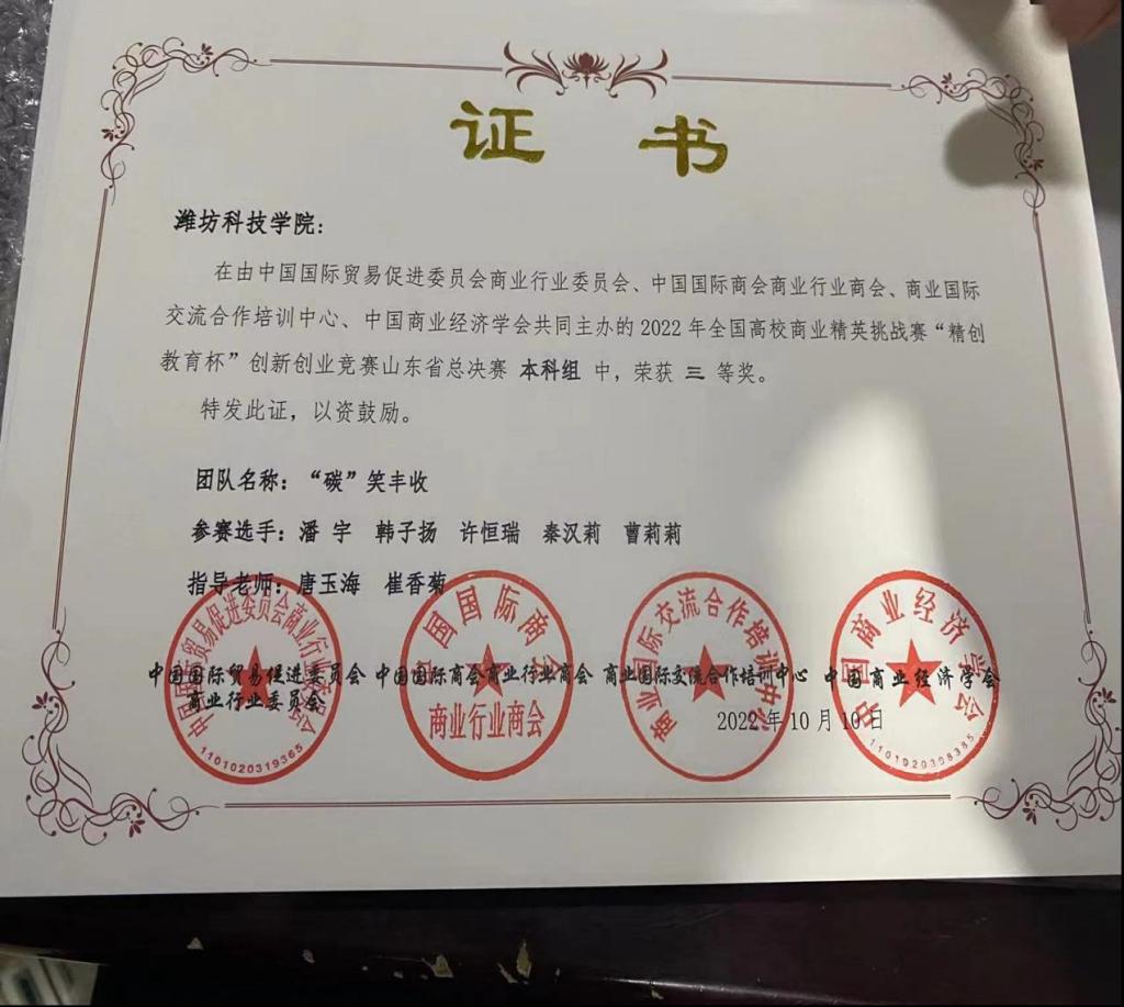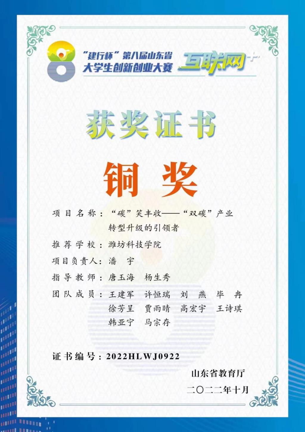从“苟日新,日日新,又日新”到“惟创新者进,惟创新者强,惟创新者胜”开拓创新精神,再加之以优秀的班级学风,使团支部成员具有敢想敢做敢创的魄力,从而在创新创业这一领域中大放异彩,取得的奖项可谓是硕果累累:在第八届“互联网+”创新创业校赛中,有两名同学获得两项金奖;在省赛中有两名同学获得两项银奖,有两名同学获得两项铜奖。在第十三届“挑战杯”山东省老员工创业计划竞赛中,有一位同学斩获省金这一好成绩。此外,还有一位同学获得全国高校精英挑战赛“精创教育杯”山东省创新创业竞赛总决赛本科组三等奖,而另一位同学斩获寿光市与潍坊市创业大赛优秀奖和第七届创客中国优秀奖。